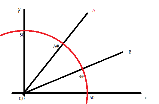 A 또는 B 와 같은 위치의 좌표를 알고 있을 때 원점 기준 50 만큼 떨어진 곳의 좌표을 얻어야 할 때 식