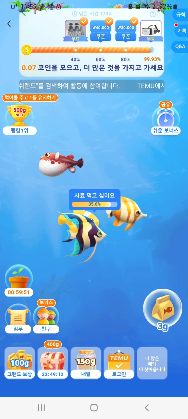 테무 피쉬랜드 0.07 만 채우면 무료 상품을 받을 수 있다.