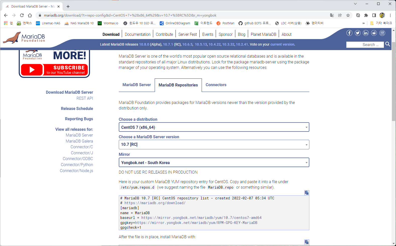 1. 아래의 MariaDB 사이트 접속 download 메뉴에서 대상 OS 선택 후 사용 가능한 MariaDB 버전을 선택